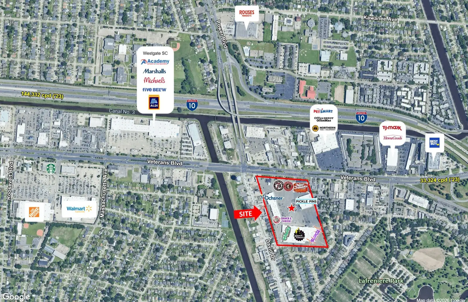 Located on the busy Southeast Quadrant of Veterans Boulevard and David Drive, the center is along a commercial corridor near residential neighborhoods by Lafreniere Park. It is easily accessible from I-10 and via major Metairie thoroughfares West Napoleon Avenue, Power Boulevard, and David Drive. There are five curb cuts and an ample parking field with more than 900 spaces. Pylon signage and outward facing storefronts provide high visibility.
