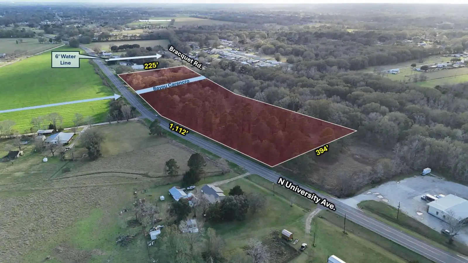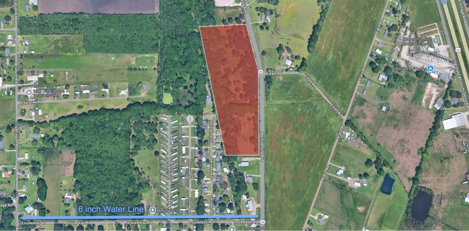The property located in the 5000 Block of N. University Avenue, Carencro, LA, is situated approximately one mile southwest of the N. University Avenue and Interstate 49 interchange. Positioned in an unincorporated area of Lafayette Parish, the property is not currently zoned, providing flexibility for future commercial or residential development. The site is located in Flood Zone X and features generally flat, level topography. A drainage channel approximately 25' in width runs east to west across the southern-central portion of the property. Public water infrastructure is available nearby, with a 6" waterline located at the intersection of Louveteau Road and N. University Avenue (Hwy 182), approximately 700' south of the subject property.
