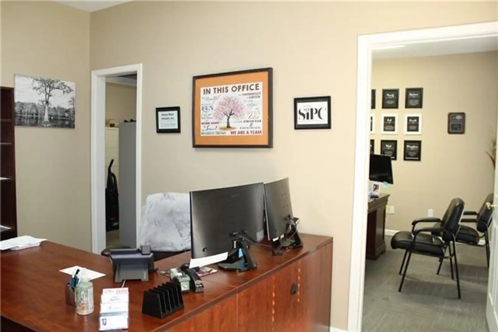 Now available: Suite B, a flexible and well-appointed office suite located in the heart of Downtown Alexandria. This space includes three large private offices, each with direct access to its own adjacent file/storage room. The suite also offers access to a shared common area, featuring a fully equipped kitchen, comfortable break area, and copy/printing zone—ideal for day-to-day office needs. Convenient private parking is available behind the building, with additional street parking right out front. This prime downtown location is within walking distance of local businesses, dining, and government buildings. Lease options are flexible: Lease all three offices together, Or lease Office 1 separately and Offices 2 & 3 as a pair. Perfect for professionals, satellite offices, or small businesses seeking a central location with great amenities.