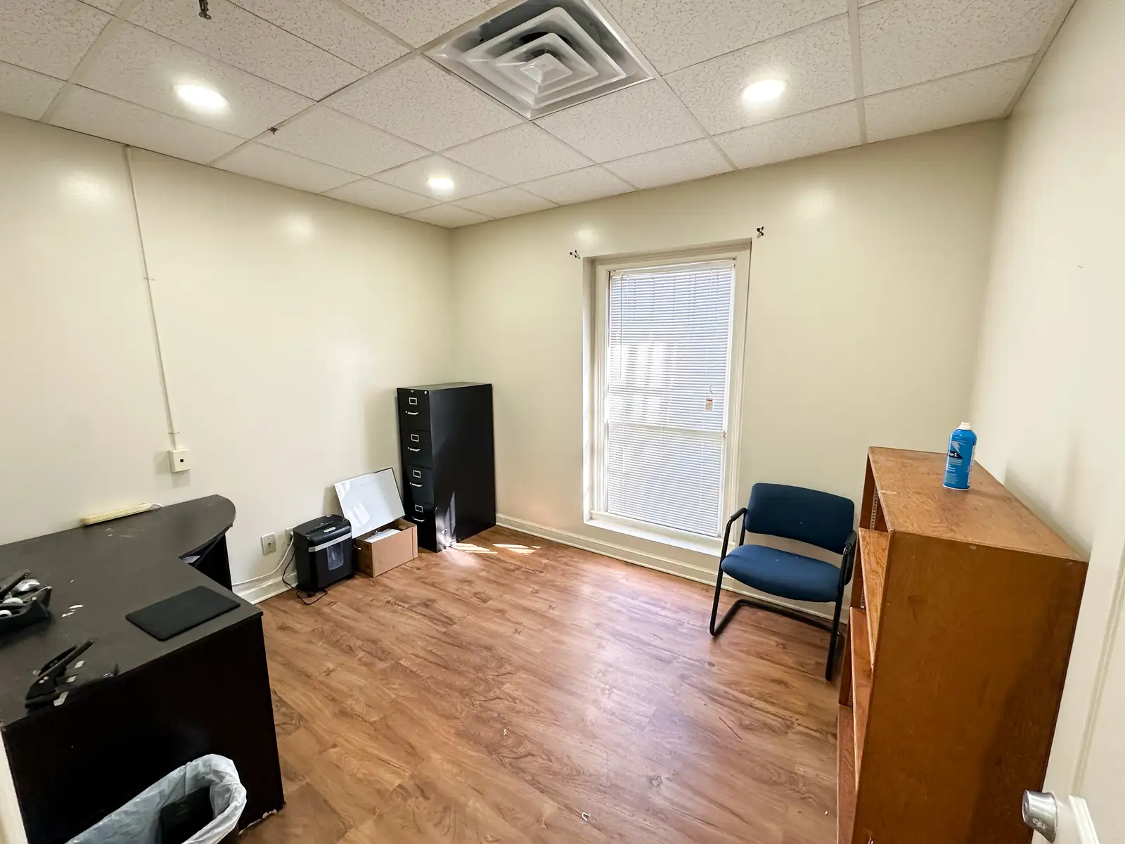 The office area includes five private offices, one conference room, one copy/workroom, and two restrooms, providing an efficient and professional layout suitable for administrative or client-facing operations. The warehouse portion features approximately 18-foot ceiling height, one roll-up door, and is fully conditioned, allowing for comfortable and functional use for storage, light industrial, service, or distribution operations.