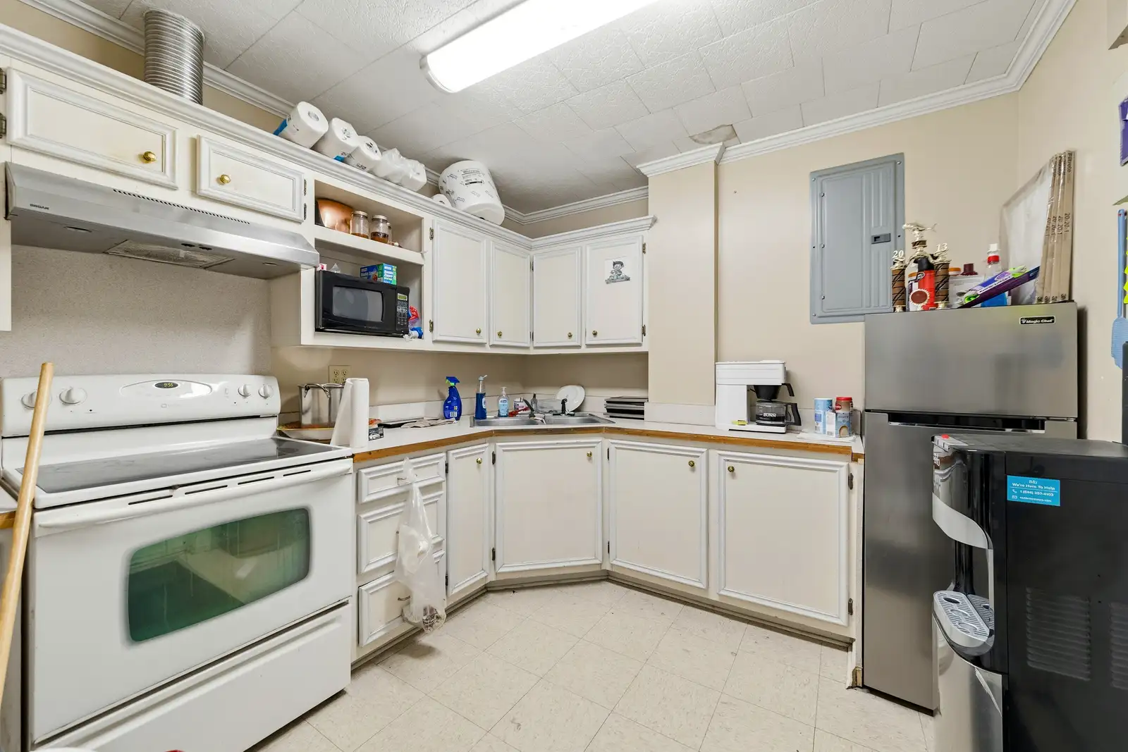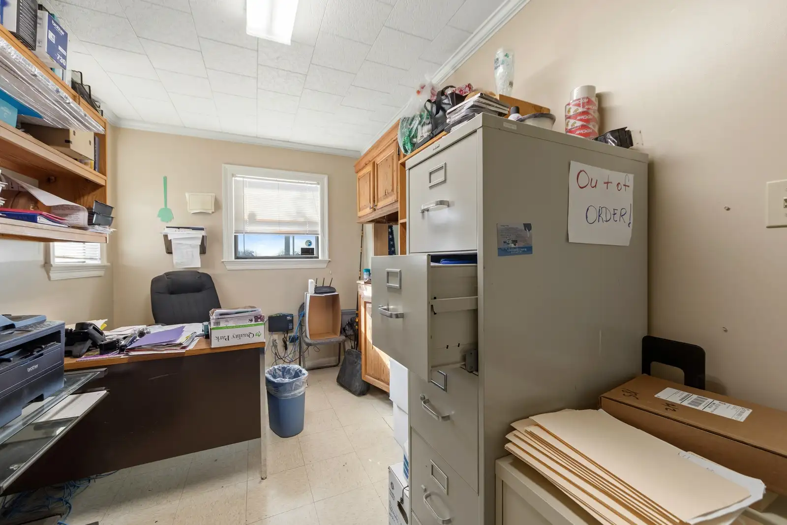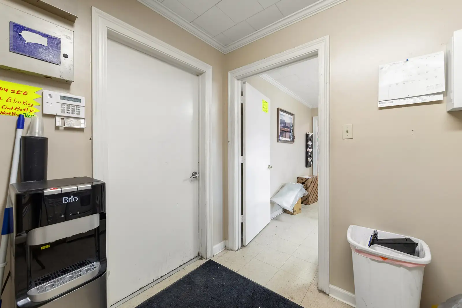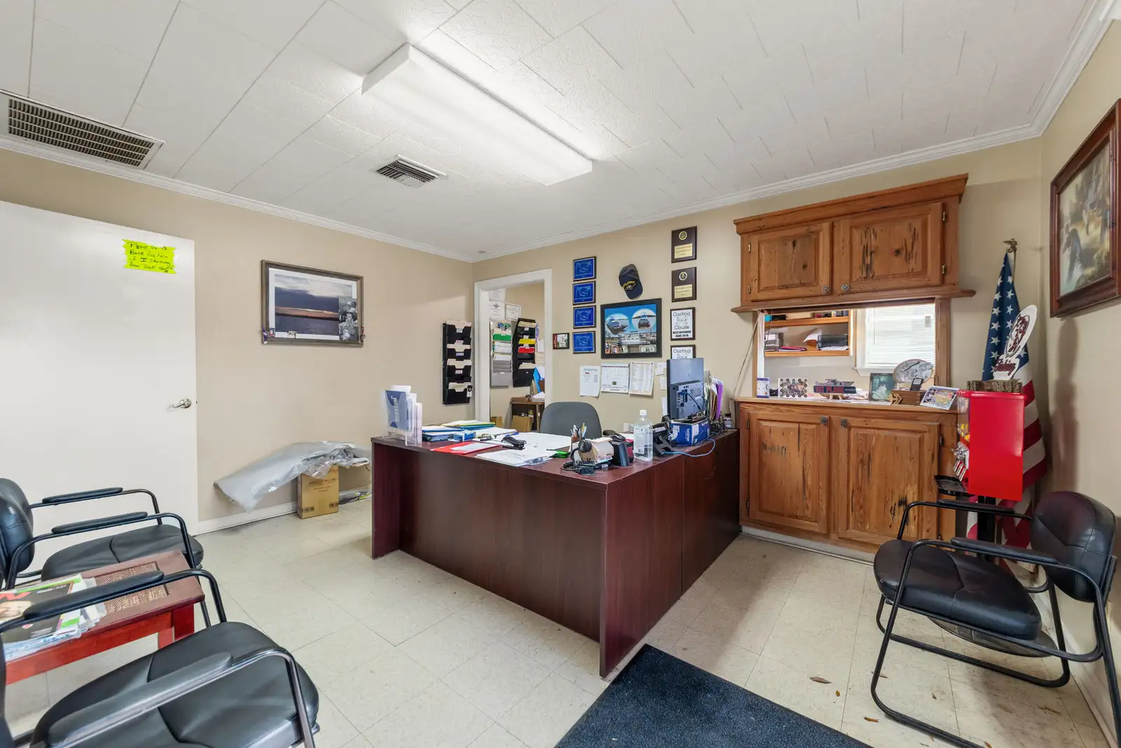 - Has a front office for customers which includes a receptionist area/lobby, a private office, 1 kitchen/break room area and a restroom.