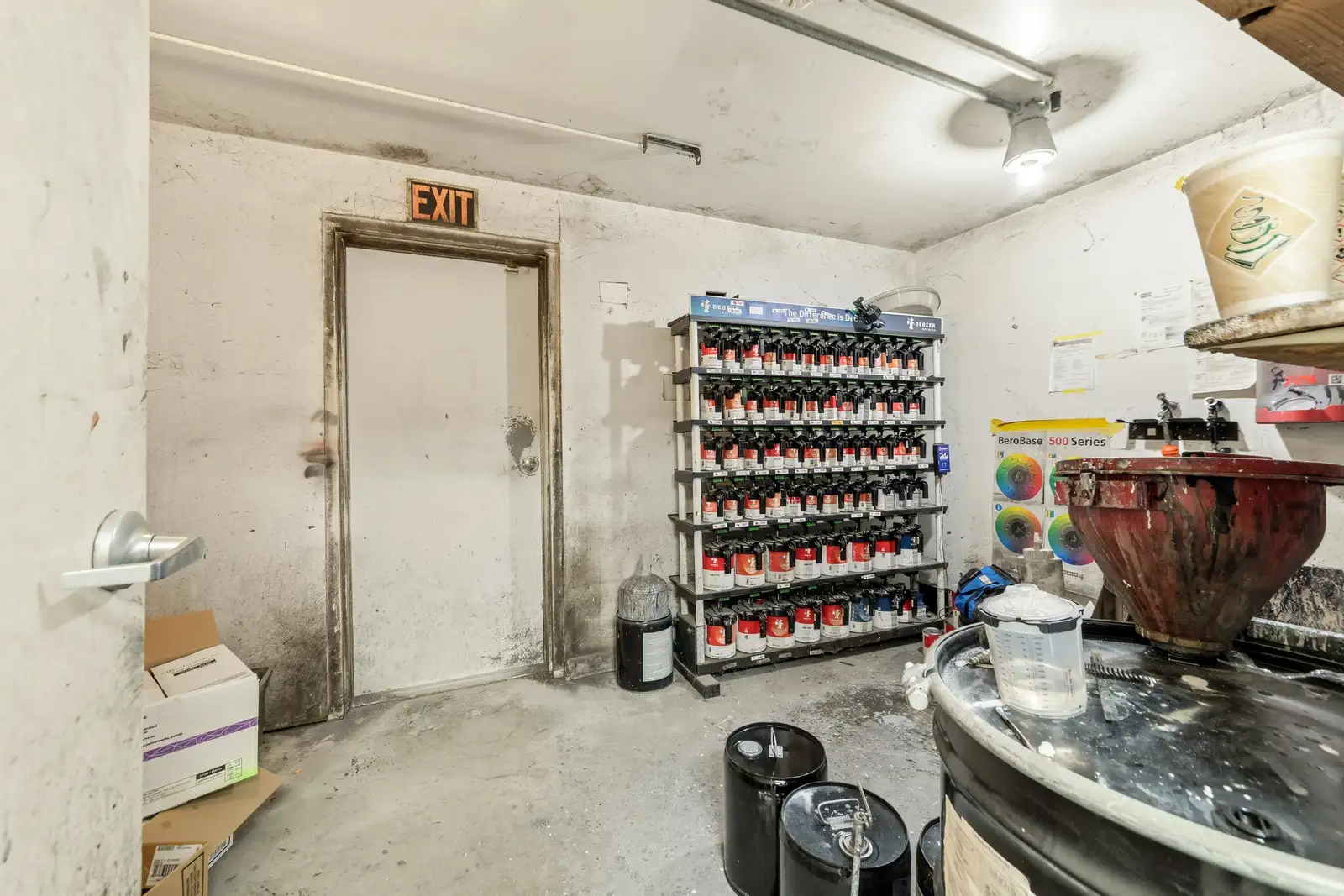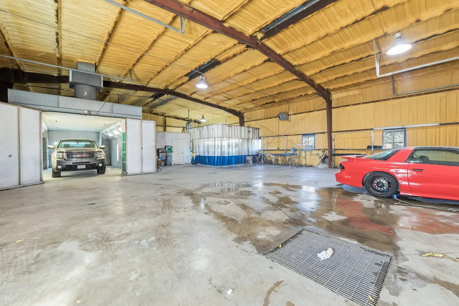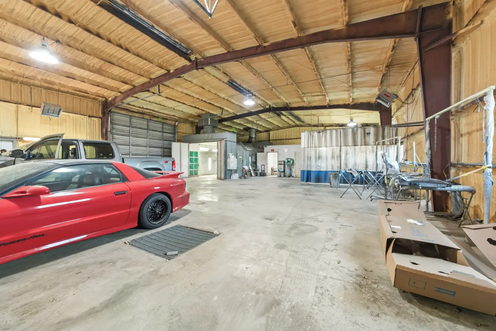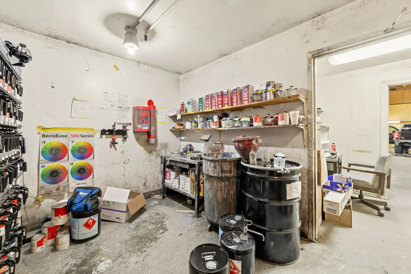 - Warehouse has 3 roll up doors, a paint mixing area and an additional smaller shop area for small parts and/or additional storage