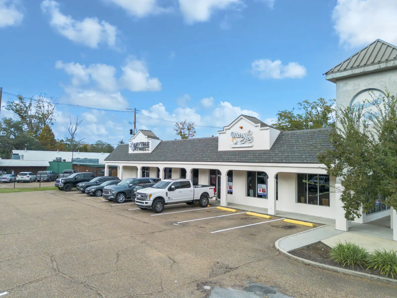 Current co-tenants and nearby businesses include Mary Lee Donuts, Subway, Johnny's Pizza, Peregrin's Florist, Anytime Fitness, Golden Needle Tailor Shop, Barber of Seville, and George's Southside across the street.
