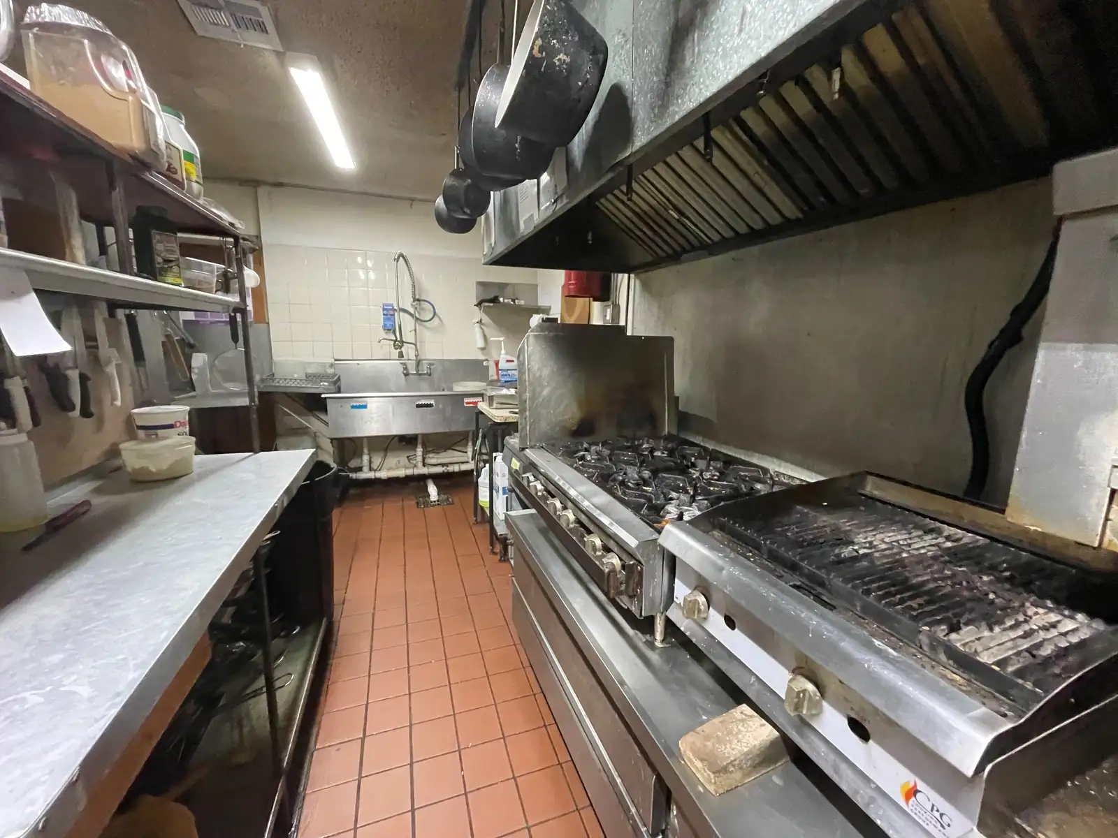 30 diners. Between the two dining areas are two restrooms. Commercial kitchen has overhead fire suppression and