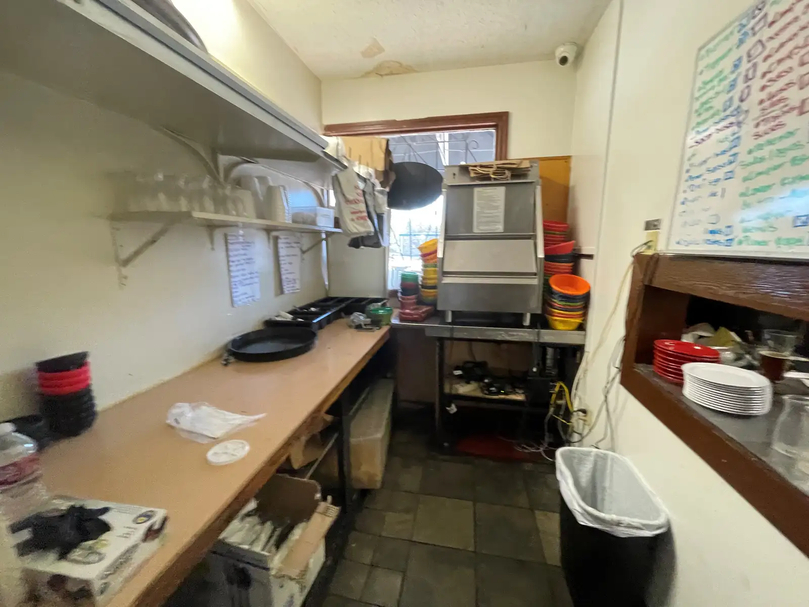 Kitchen and storage/work areas finished with vinyl tile floor coverings and fluorescent light fixtures