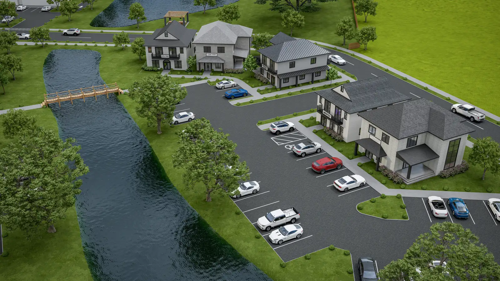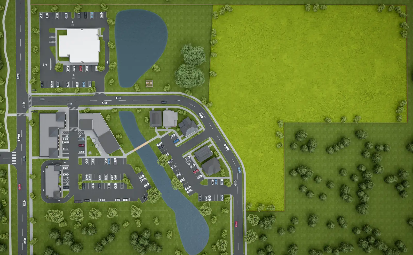 - Scenic ponds, gazebo, and pedestrian bridge connecting key areas