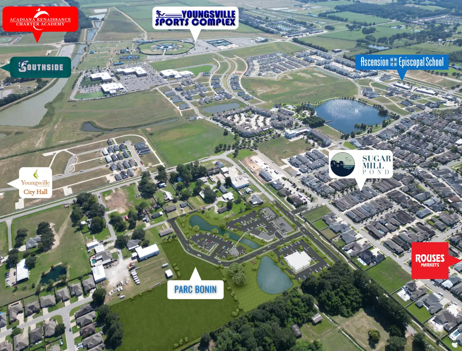 Anchored by a brand-new Ochsner internal medicine clinic, Parc Bonin will generate consistent daily traffic and serve as a central hub for healthcare, business services, and neighborhood retail. Positioned directly across from Sugar Mill Pond and near the Youngsville Sports Complex, Rouse’s Market, and multiple schools, the site benefits from strong demographics, high household incomes, and a rapidly expanding population base.