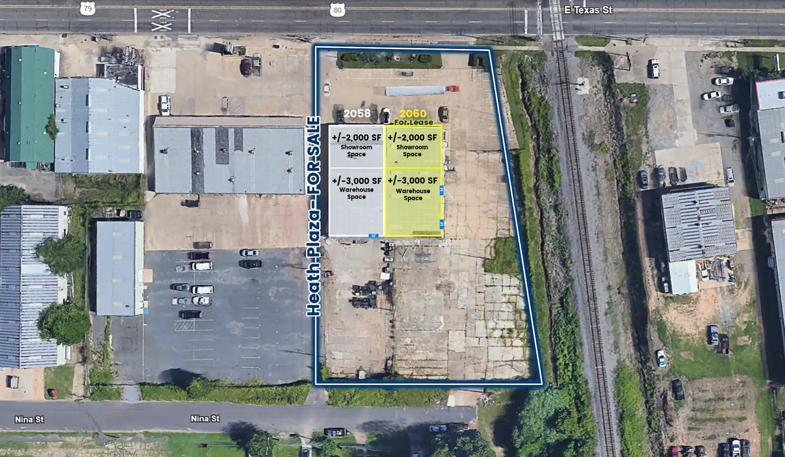 Heath Plaza is a partially leased commercial property totaling +/-10,850 SF on a ±1.25-acre C-3 zoned lot, located along high-traffic East Texas Street. The property offers dual access from E. Texas Street (front) and Nina Street (rear), with the rear entrance accommodating larger truck access. A paved and fenced yard approximately 190' x 130' provides secured outdoor functionality.
