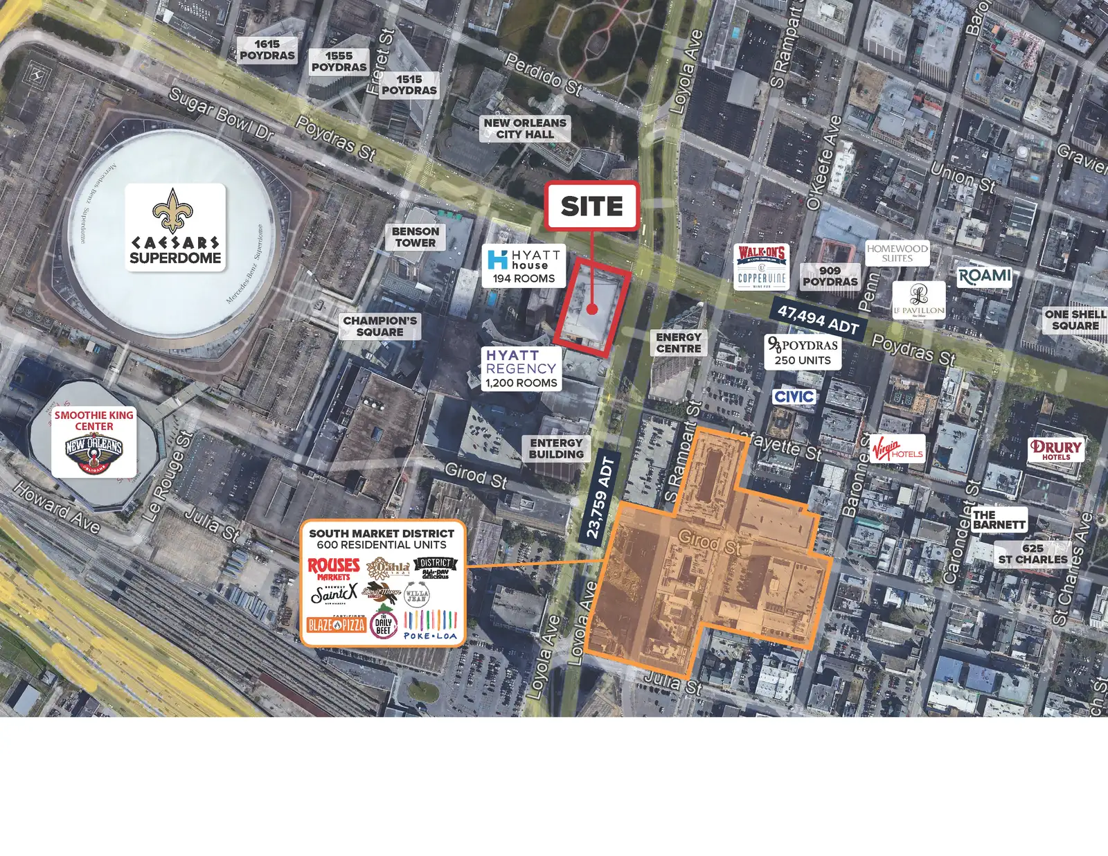 - Traffic counts: Poydras St 47,494 ADT | Loyola Ave 23,759 ADT