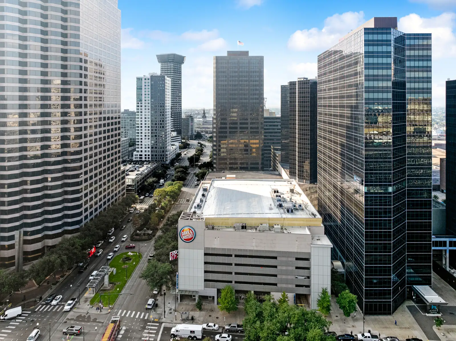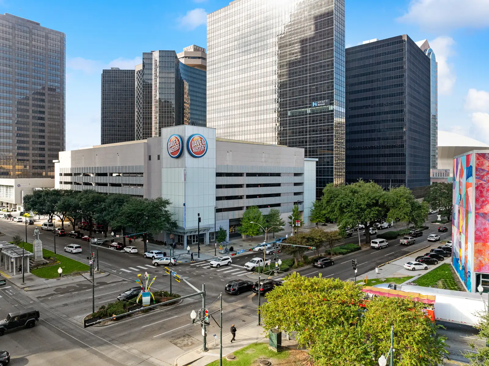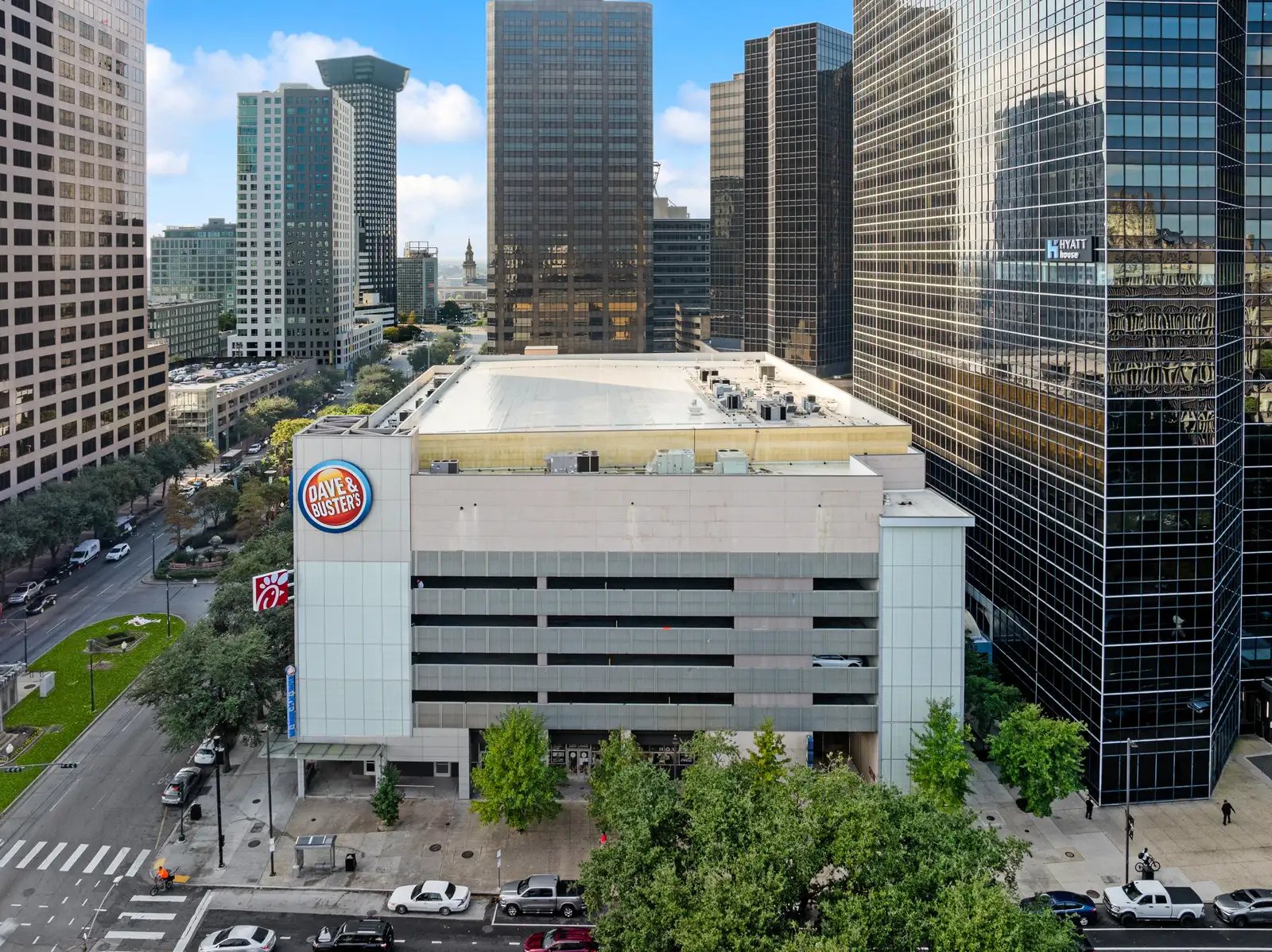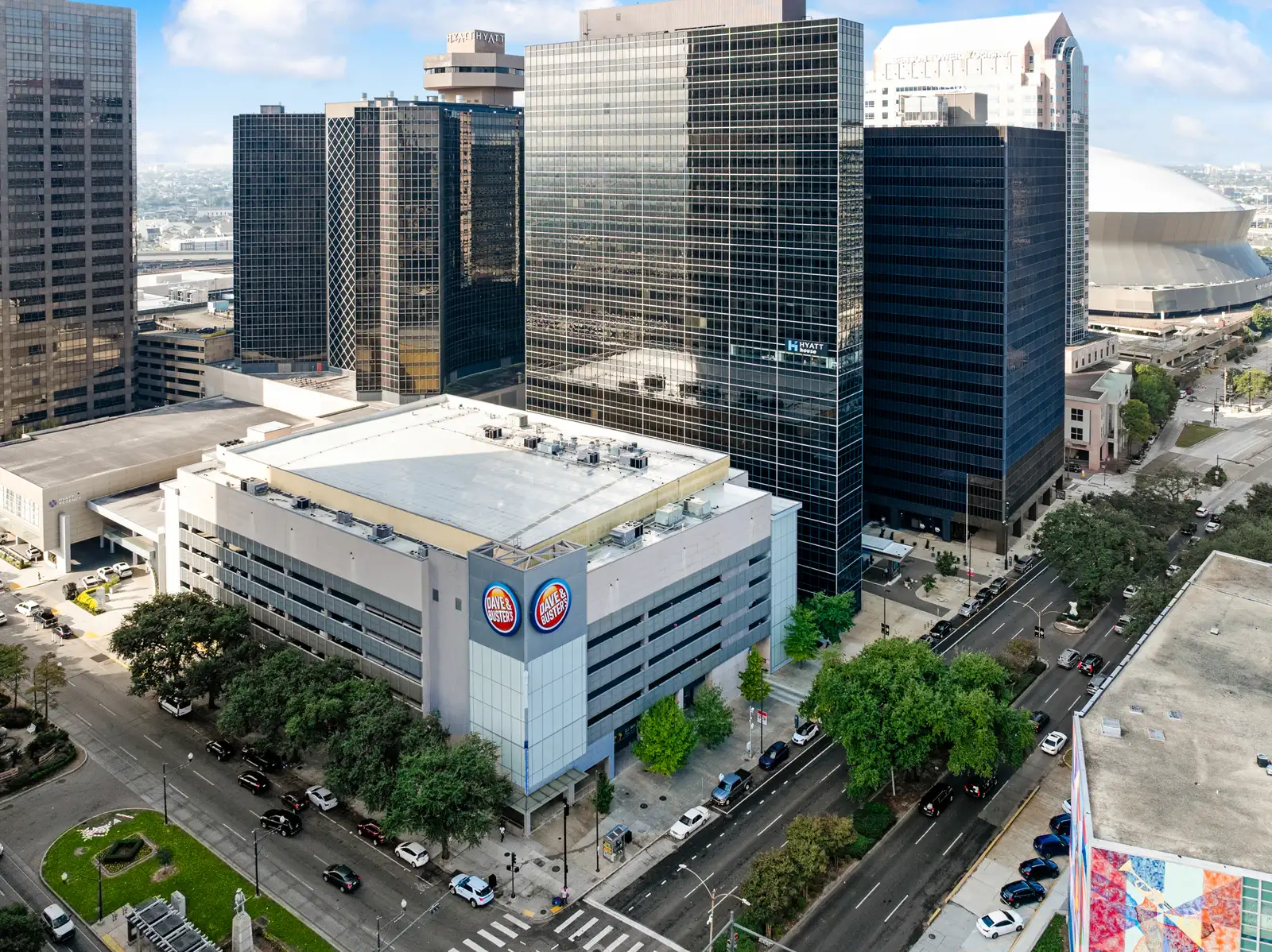 The property sits within one of the most active pedestrian and transit corridors in the CBD, surrounded by hotels, office buildings, residential towers, and year-round destination traffic. Major adjacent anchors include Caesars Superdome, Champions Square, the Hyatt Regency Hotel, Entergy Tower, and New Orleans City Hall. The building also features a multi-level parking garage with 353 spaces and is anchored by Dave and Buster’s on an upper floor. The retail tenant mix includes Chick-fil-A, Hurts Donut, and soon to be open Juicy Seafood. Tenants include corporate or personal guarantees and are all on long term leases.
