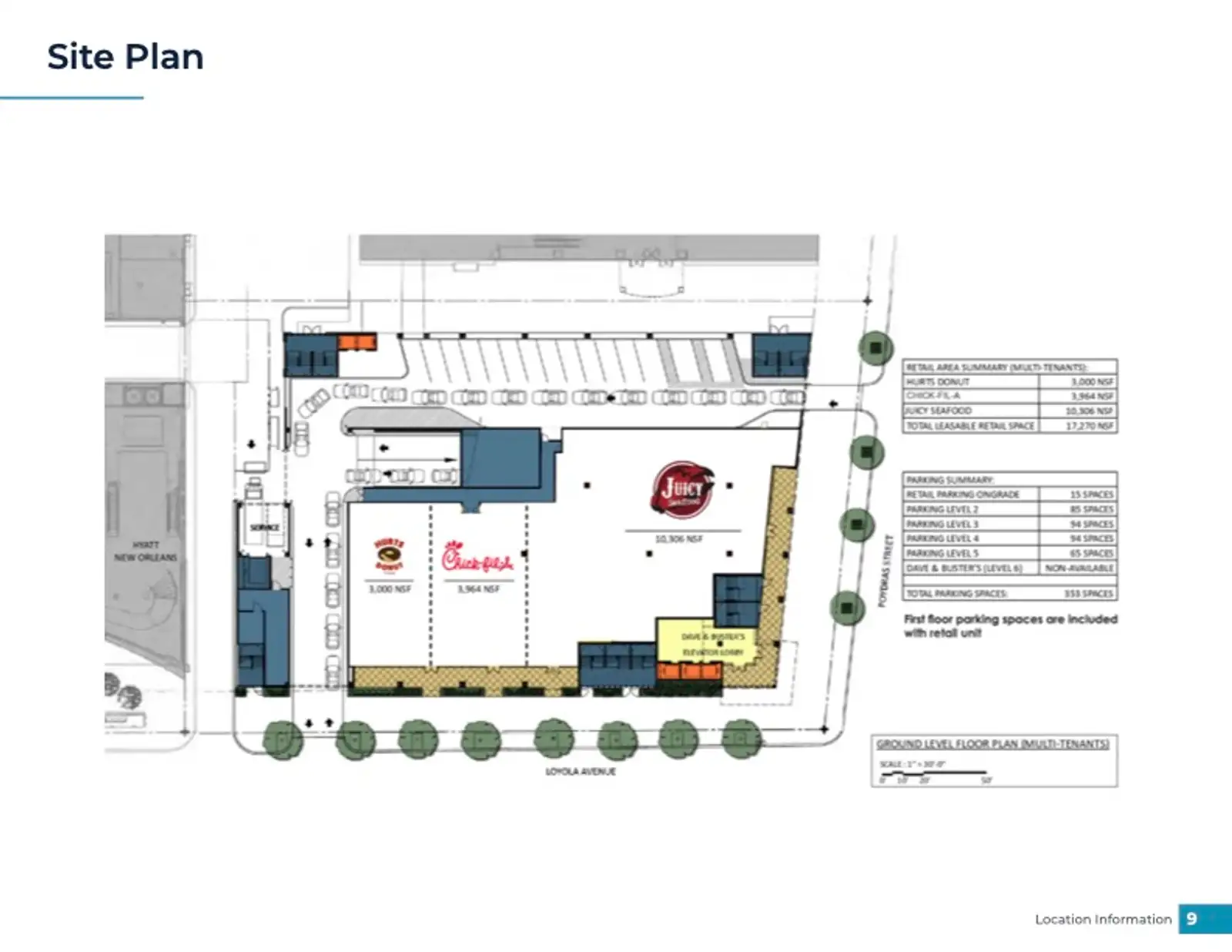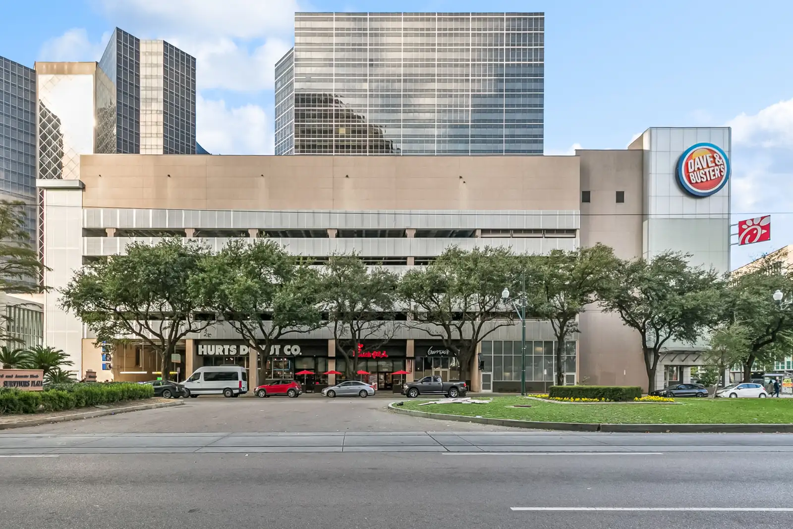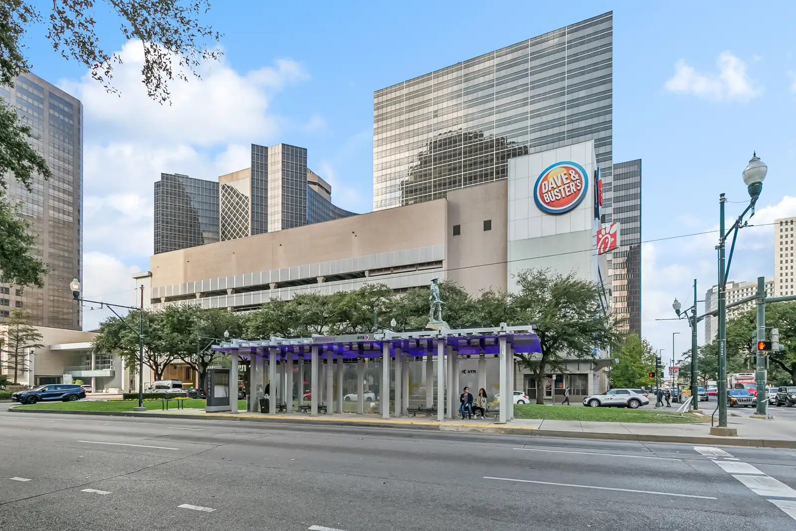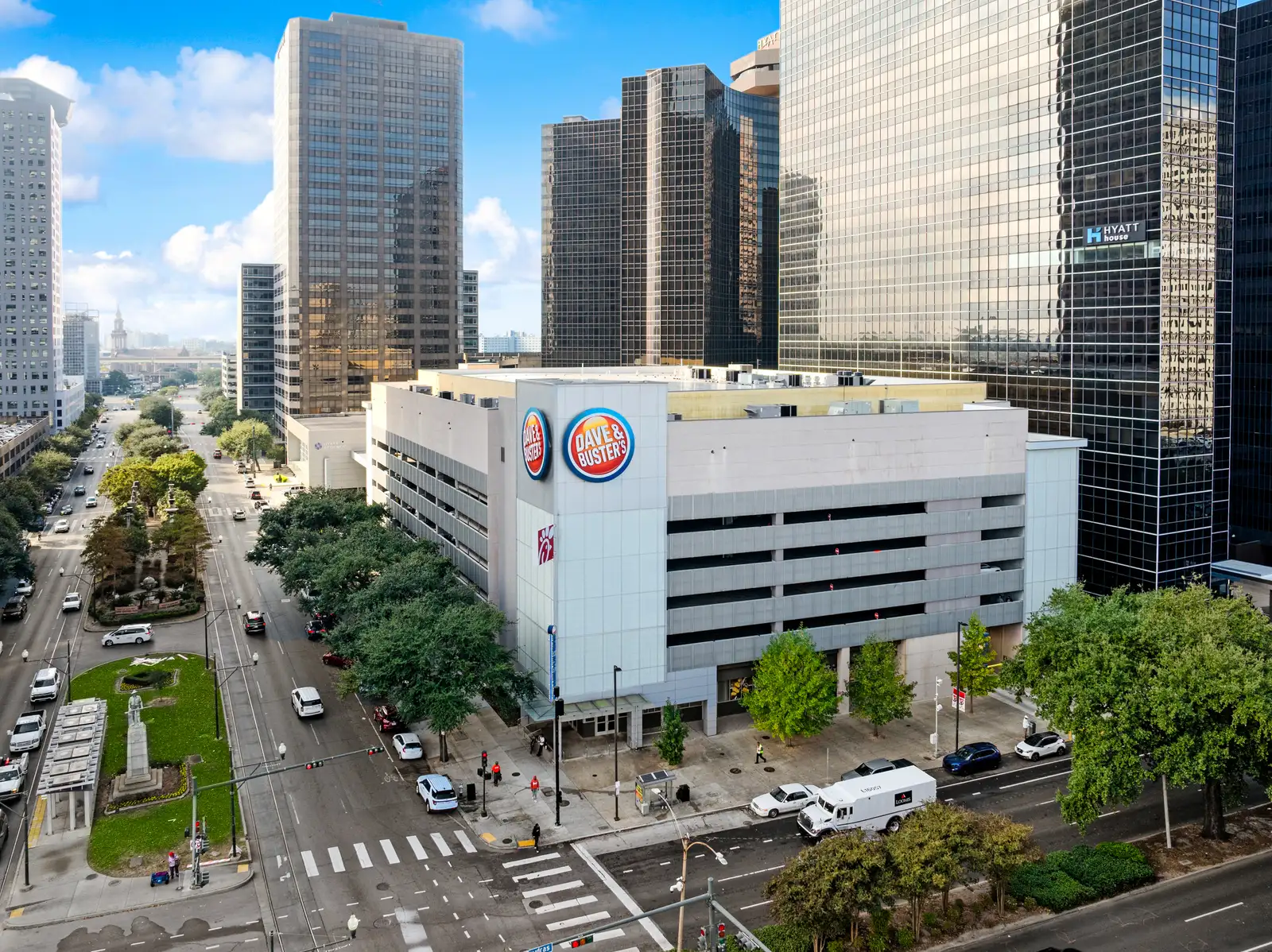 The property sits within one of the most active pedestrian and transit corridors in the CBD, surrounded by hotels, office buildings, residential towers, and year-round destination traffic. Major adjacent anchors include Caesars Superdome, Champions Square, the Hyatt Regency Hotel, Entergy Tower, and New Orleans City Hall. The building also features a multi-level parking garage with 353 spaces and is anchored by Dave and Buster’s on an upper floor. The retail tenant mix includes Chick-fil-A, Hurts Donut, and soon to be open Juicy Seafood. Tenants include corporate or personal guarantees and are all on long term leases.