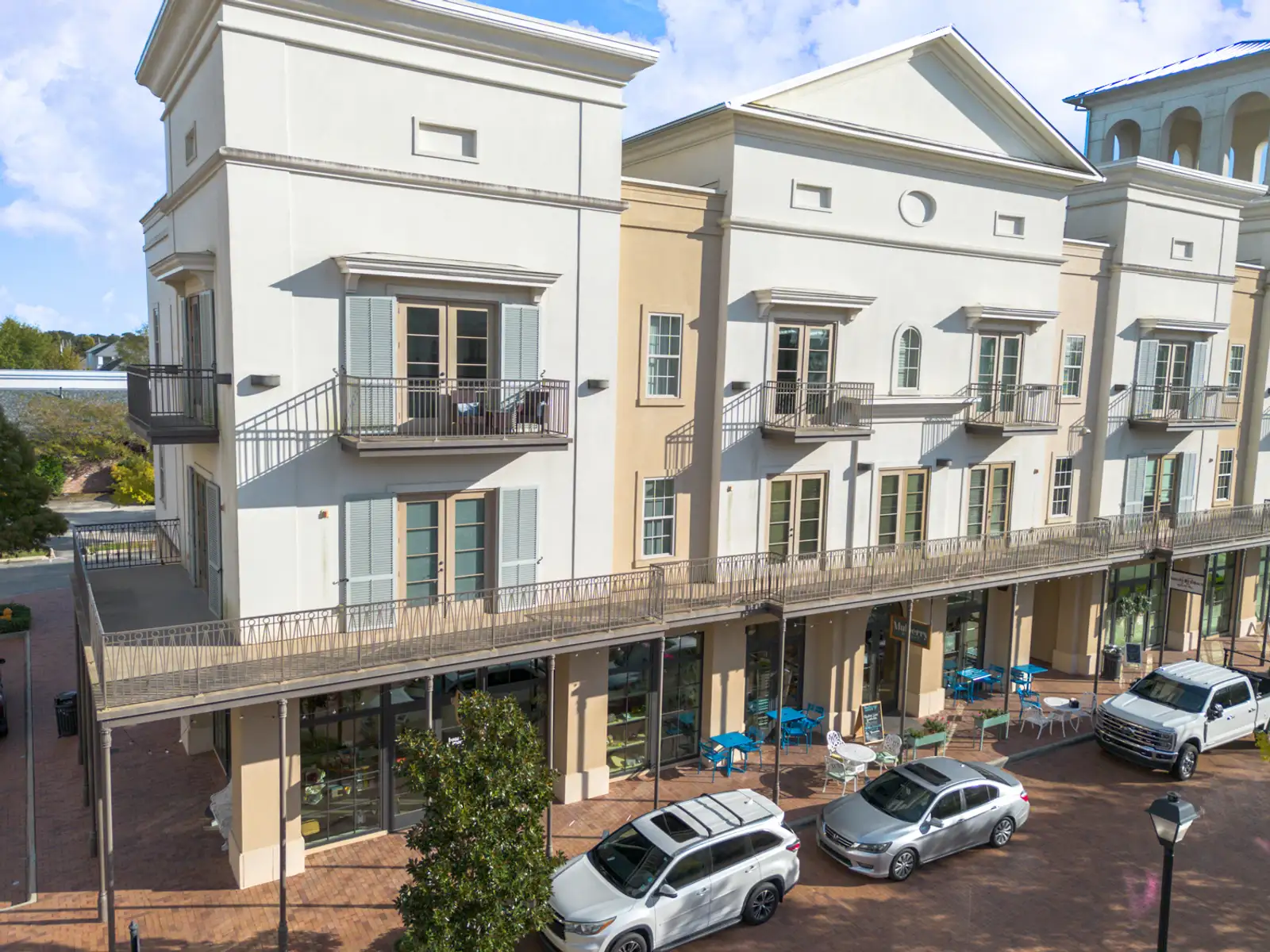 This upscale center features brick pavers, first-class finishes, and a curated mix of residential condos alongside retail, restaurant, and boutique office tenants including Rêve Coffee, Bistro Byronz, POSH Boutique, and Hollingsworth Design.