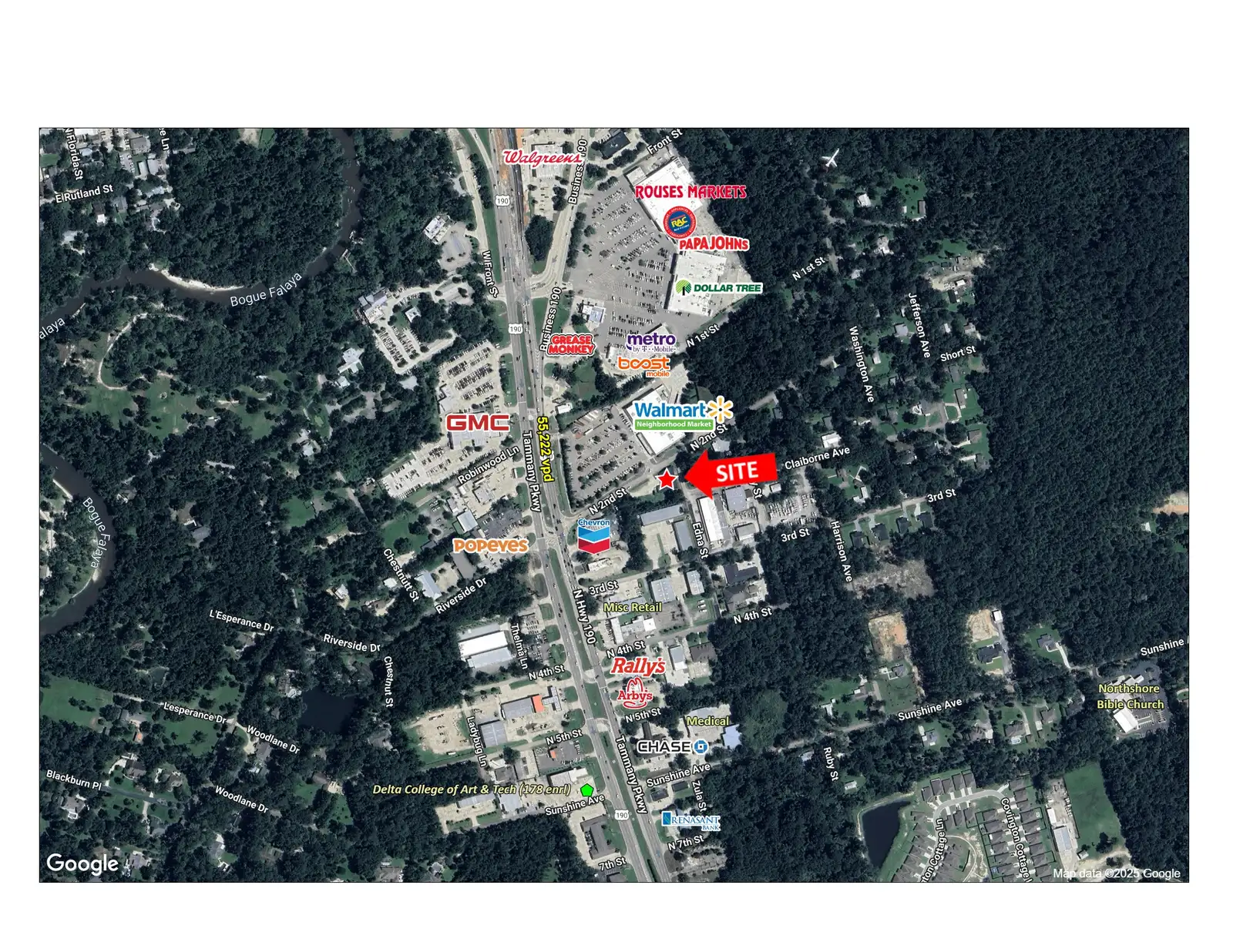 This neighborhood shopping center is located just off Highway 190 near the I-12 interchange, offering easy access and a steady local traffic flow 55,222 vpd. Positioned across the street from Walmart Neighborhood Market, the property benefits from consistent nearby activity and established surrounding businesses. Three of the four suites are currently leased, creating a stable foundation for the center. With a front parking lot and simple ingress and egress from Highway 190, the site provides a practical location for local service, office, or retail uses.