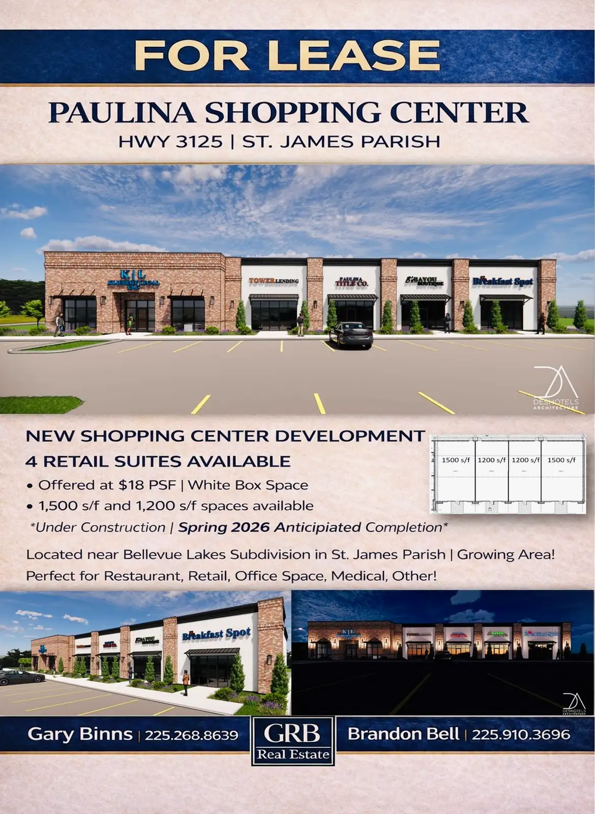 Now pre-leasing at Paulina Shopping Center, a new construction neighborhood retail development located along Hwy 3125 in St. James Parish. This modern retail center is positioned near the Bellevue Lakes Subdivision, serving a growing residential base with limited nearby retail options—making it an ideal opportunity for restaurant operators, food & beverage users, and service-oriented businesses seeking expansion or a new location.