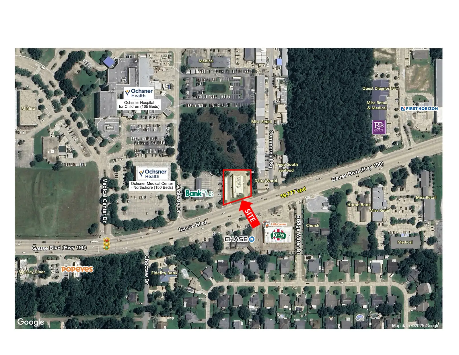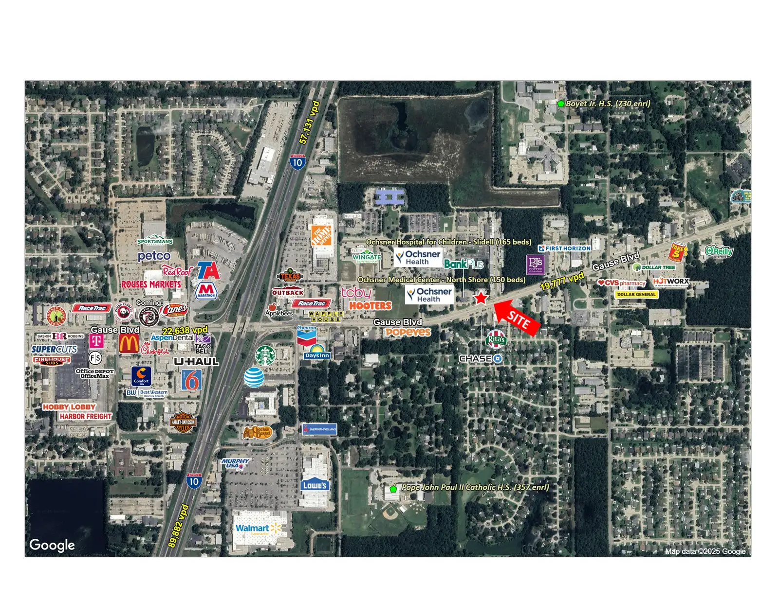 This 1,323-sf freestanding building is situated on a 0.56-acre site along Gause Boulevard in Slidell. The property is positioned along a strong commercial corridor with high visibility and in close proximity to Ochsner Medical Center, Slidell Memorial Hospital, and national retailers. Formerly a Sonic, this property is ideal for a quick-service restaurant.