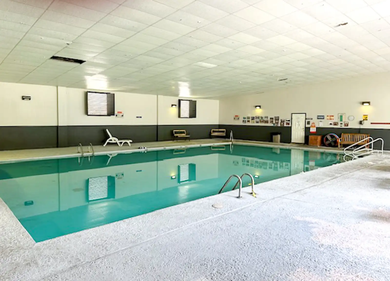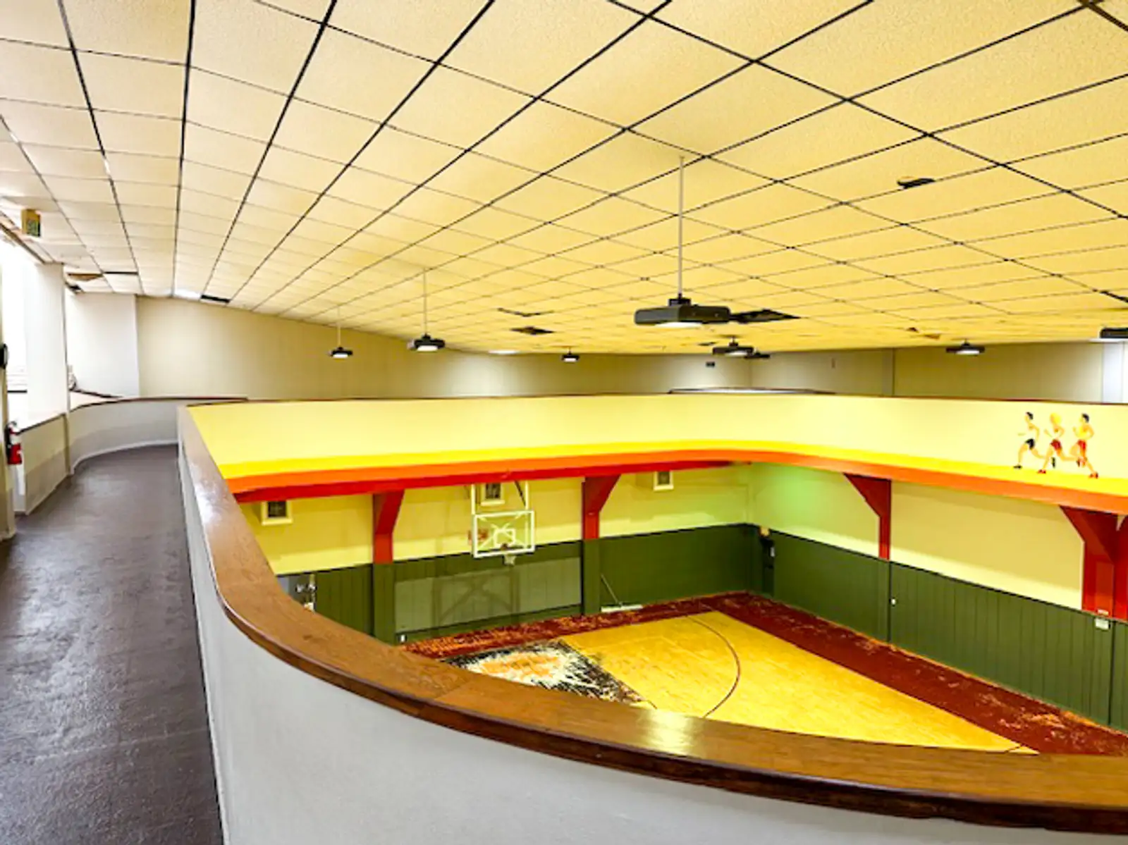 Fully heated and cooled, the facility features ceiling heights of 30+ feet, an indoor basketball court, walking track, pool, locker rooms, and multiple open-span areas.