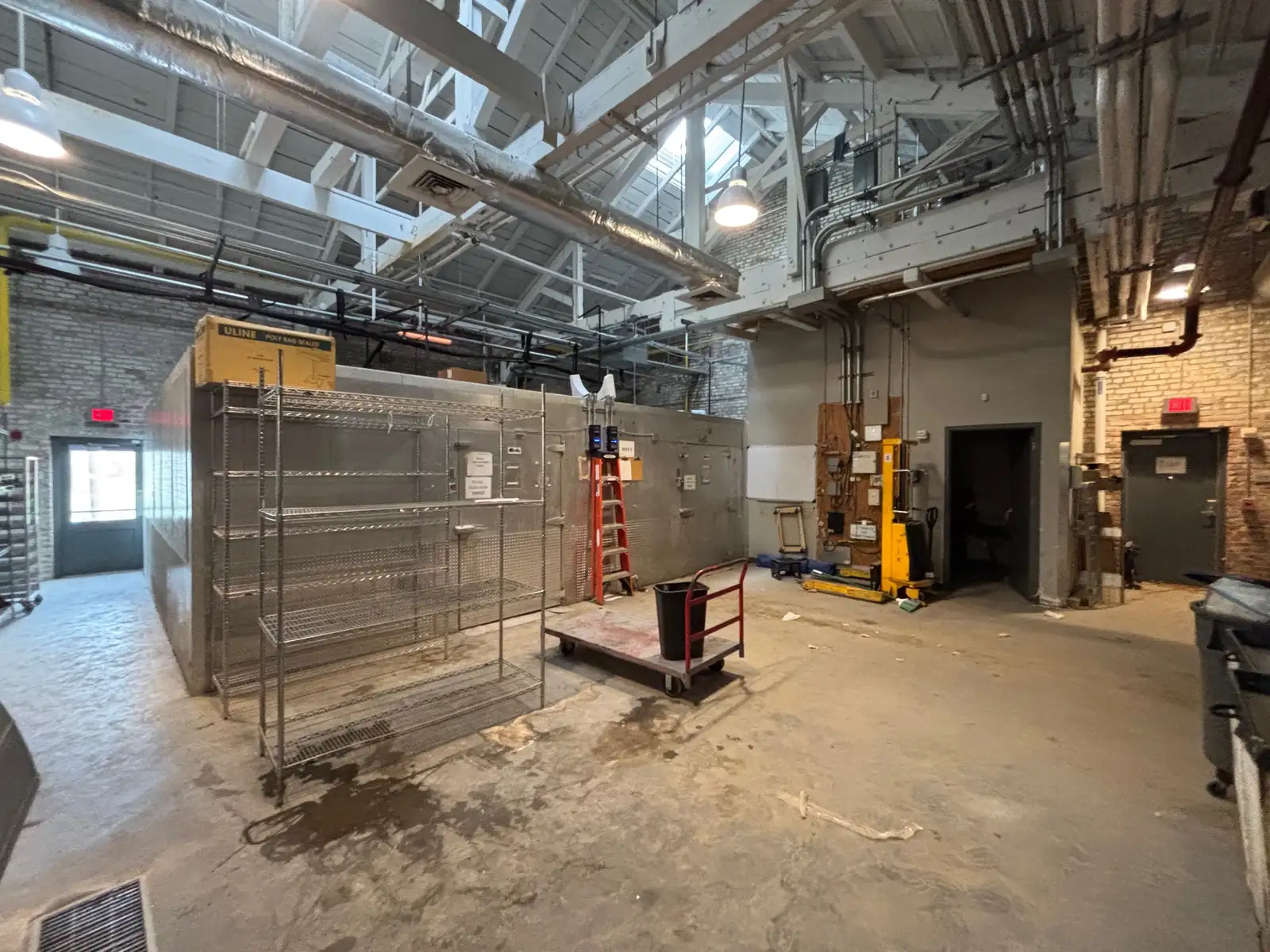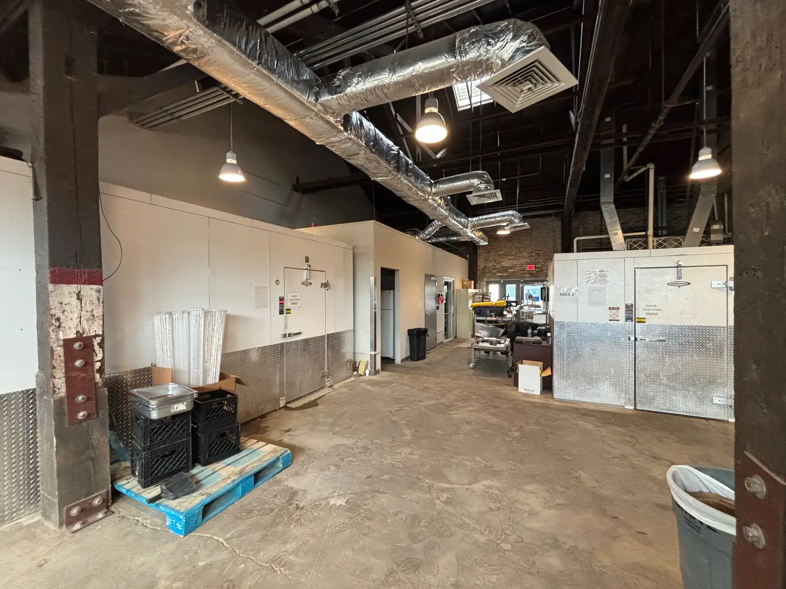 Featured at the rear of the building, this 8,315 SF commercial kitchen comes fully equipped with a range of commercial cooking implements: commercial hoods, several walk-in fridge-freezers, cooking equipment, in-floor drains, etc. All spaces are fully equipped with HVAC. This space is divided into three areas, a commercial kitchen with office + Conference room, and two loading bays with access to overhead doors (total of 6) + additional cold storage. Space is move-in ready for use as a commercial kitchen, but can be altered to fit other uses.