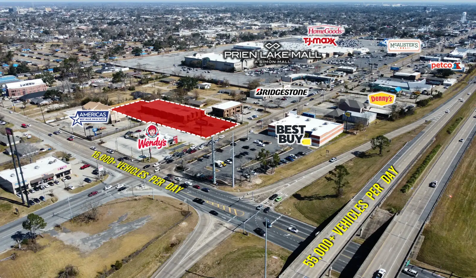 The subject property is a ±1.8 acre site on a high traffic corridor in Lake Charles, Louisiana – one of the fastest growing small markets in the U.S. The property’s location offers a great combination of solid daytime population, strong average income and complimentary area tenants. The property benefits from two points of ingress/egress (W Prien Lake Rd / Lake Street) and provides ample room for car lineup for any QSR user(s). Owners prefer to build to suit or ground lease the property.